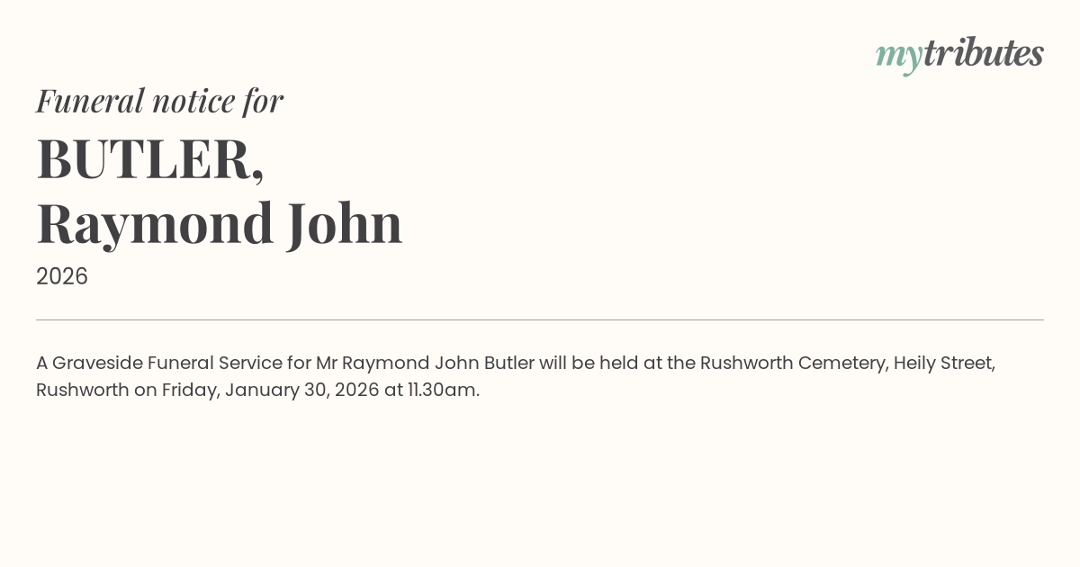 15°CA Graveside Funeral Service for Mr Raymond John Butler will be held at the Rushworth Cemetery, Heily Street, Rushworth on Friday, January 30, 2026 at 11.30am.