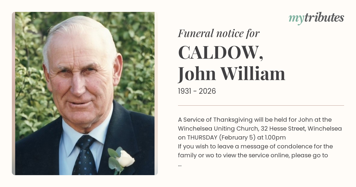 15°CA Service of Thanksgiving will be held for John at the Winchelsea Uniting Church, 32 Hesse Street, Winchelsea on THURSDAY (February 5) at 1.00pm