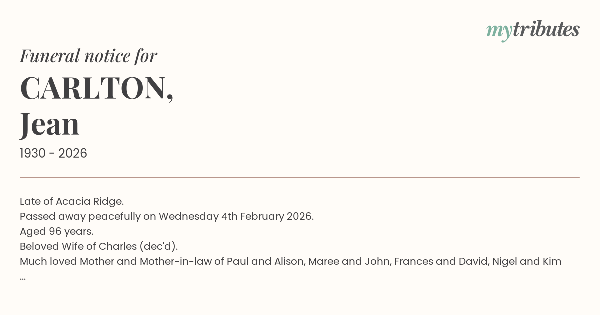 Relatives and Friends of Jean are respectfully invited to attend Her Memorial Service to be held at York Street Chapel, 65 York Street, Beenleigh on Monday 16th February 2026 at 10am.