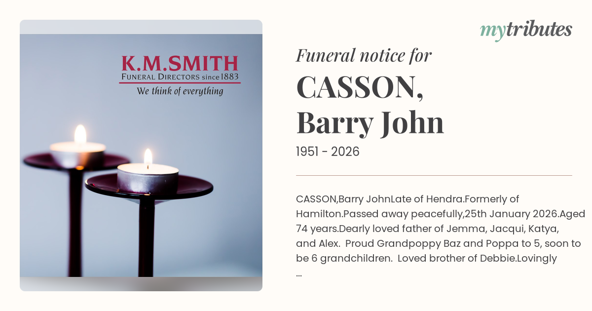 Family and friends are invited to a celebration of Barry's life in the Victory Centre, 32 Carseldine Road, Bridgeman Downs, Friday 6th February 2026 commencing at 10.30 a.m.