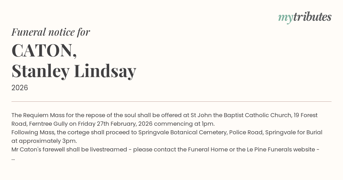 Mr Caton's farewell shall be livestreamed - please contact the Funeral Home or the Le Pine Funerals website - Upcoming Funerals, for the Link.
