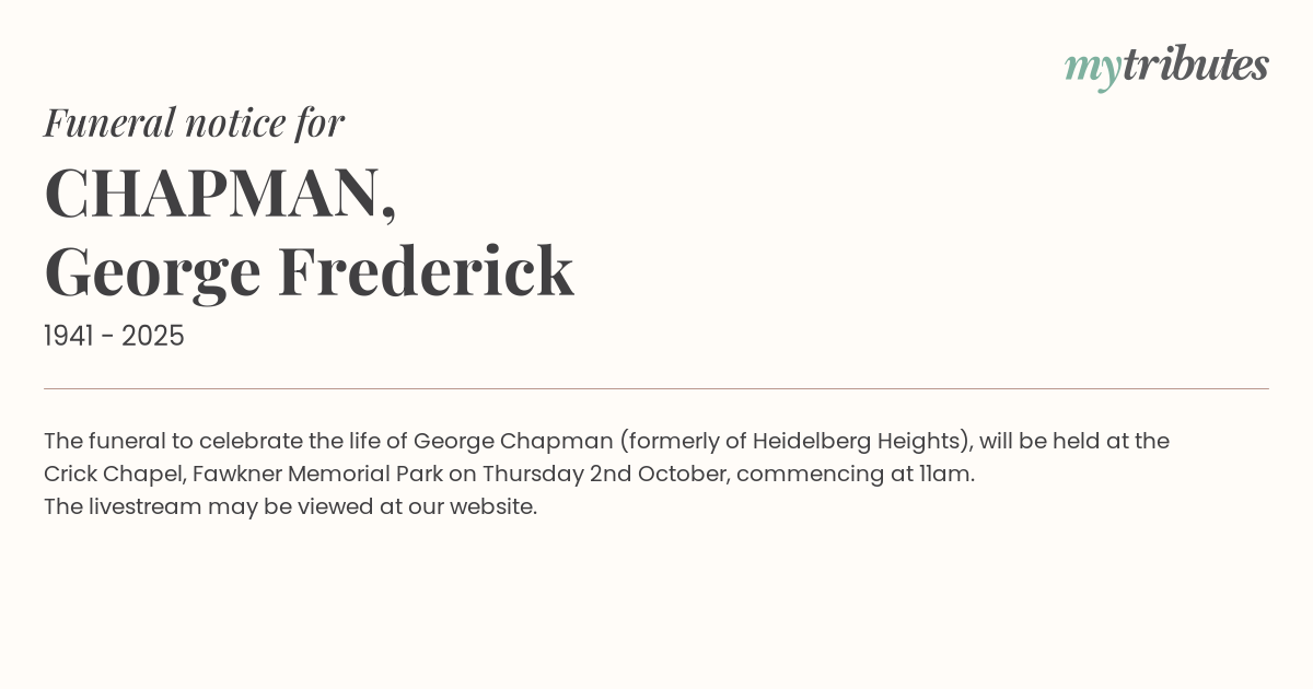 15°CThe funeral to celebrate the life of George Chapman (formerly of Heidelberg Heights), will be held at the Crick Chapel, Fawkner Memorial Park on Thursday 2nd October, commencing at 11am.