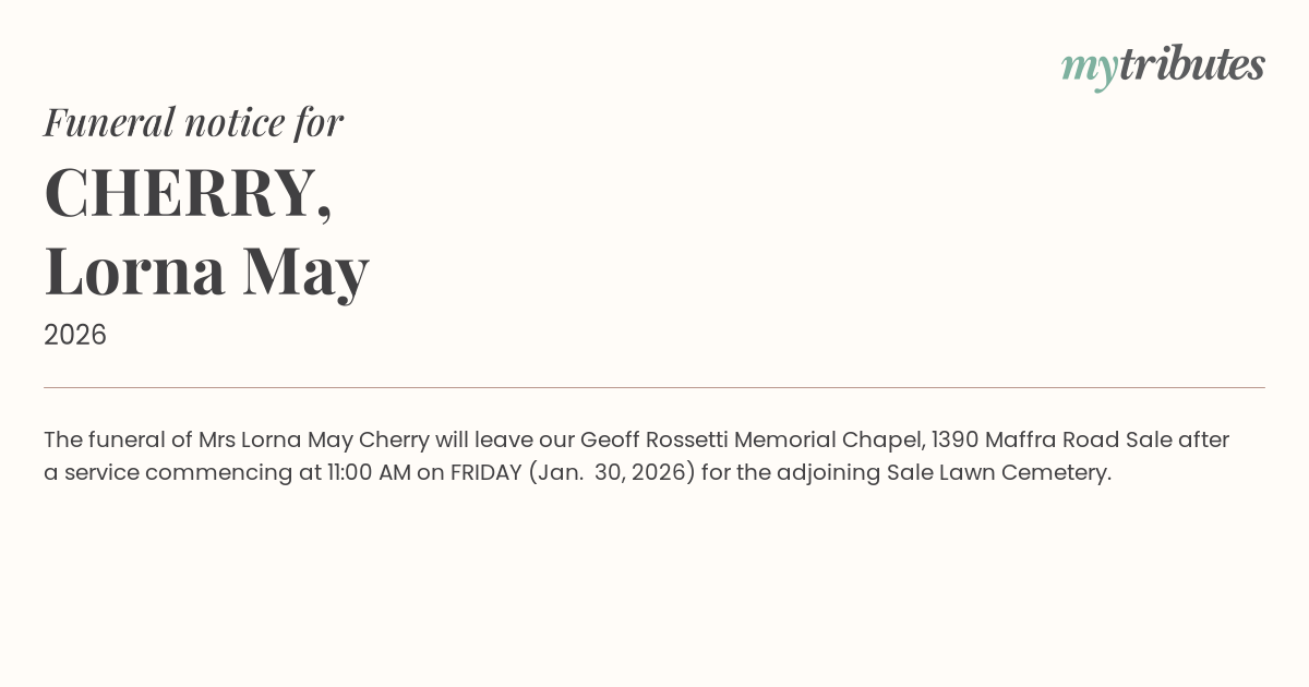 15°CThe funeral of Mrs Lorna May Cherry will leave our Geoff Rossetti Memorial Chapel, 1390 Maffra Road Sale after a service commencing at 11:00 AM on FRIDAY (Jan. 30, 2026) for the adjoining Sale Lawn Cemetery.