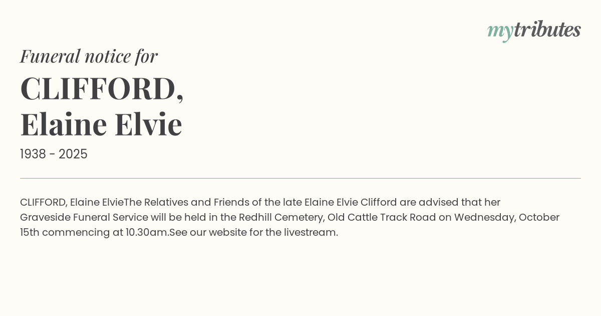 The Relatives and Friends of the late Elaine Elvie Clifford are advised that her Graveside Funeral Service will be held in the Redhill Cemetery, Old Cattle Track Road on Wednesday, October 15th commencing at 10.30am.