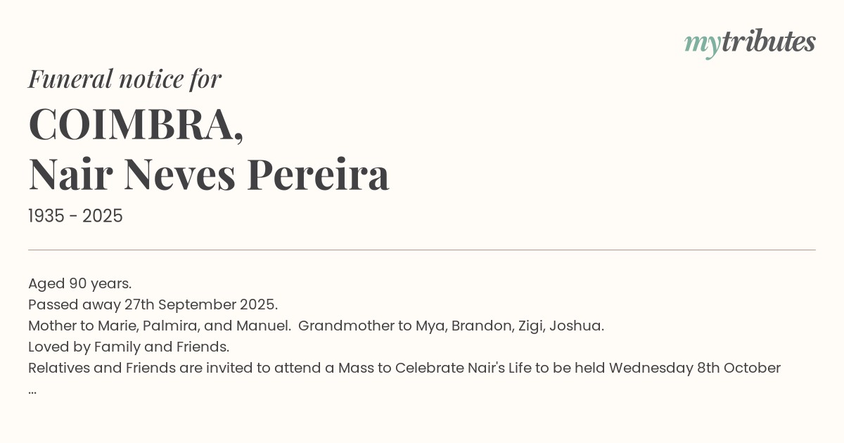 Relatives and Friends are invited to attend a Mass to Celebrate Nair's Life to be held Wednesday 8th October 2025 at 2pm in St Luke's Catholic Church, 43 Taylor St, Woolloongabba.