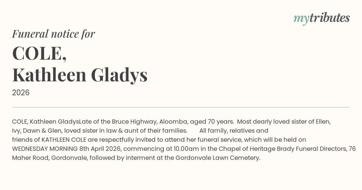All family, relatives and friends of KATHLEEN COLE are respectfully invited to attend her funeral service, which will be held on WEDNESDAY MORNING 8th April 2026, commencing at 10.00am in the Chapel