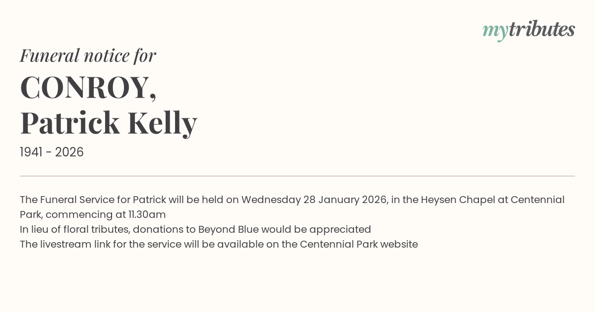 15°CThe Funeral Service for Patrick will be held on Wednesday 28 January 2026, in the Heysen Chapel at Centennial Park, commencing at 11.30am
