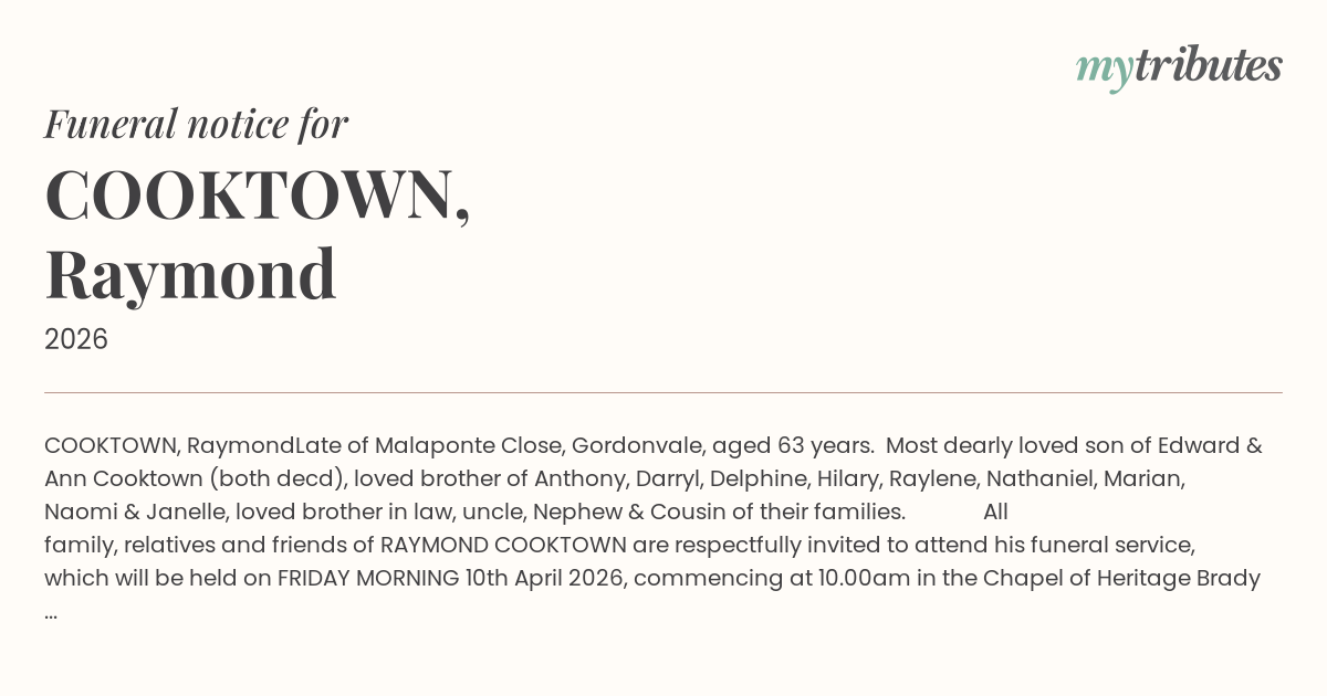 All family, relatives and friends of RAYMOND COOKTOWN are respectfully invited to attend his funeral service, which will be held on FRIDAY MORNING 10th April 2026, commencing at 10.00am in the Chapel of Heritage Brady Funeral Directors,