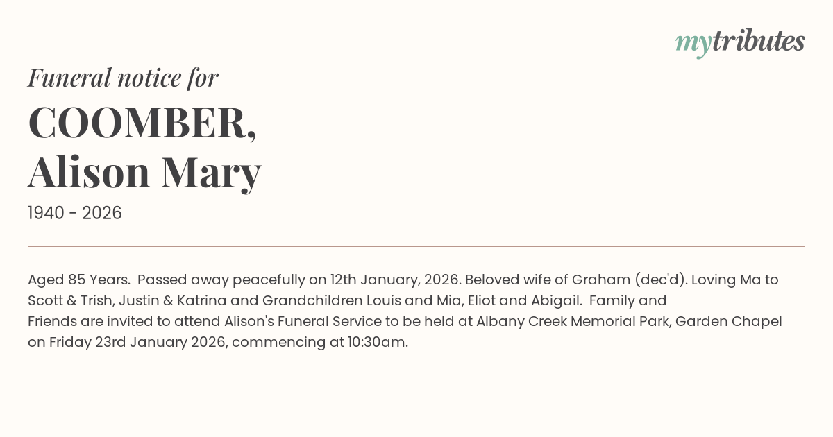 15°CAged 85 Years. Passed away peacefully on 12th January, 2026. Beloved wife of Graham (dec'd). Loving Ma to Scott & Trish, Justin & Katrina and Grandchildren Louis and Mia, Eliot and Abigail. Family and Friends are invited to attend Alison's Funeral Service to be held at Albany Creek Memorial Park, Garden Chapel on Friday 23rd January 2026, commencing at 10:30am.