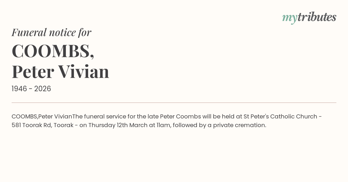 The funeral service for the late Peter Coombs will be held at St Peter's Catholic Church - 581 Toorak Rd, Toorak - on Thursday 12th March at 11am, followed by a private cremation.