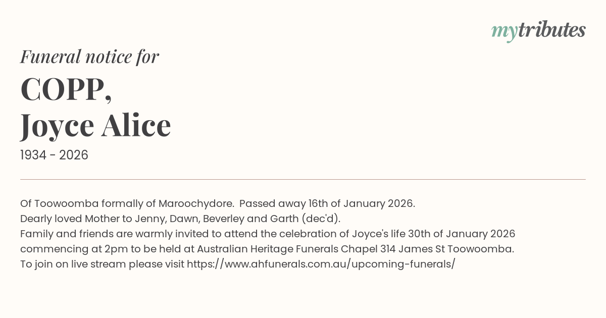 Family and friends are warmly invited to attend the celebration of Joyce's life 30th of January 2026 commencing at 2pm to be held at Australian Heritage Funerals Chapel 314 James St Toowoomba.