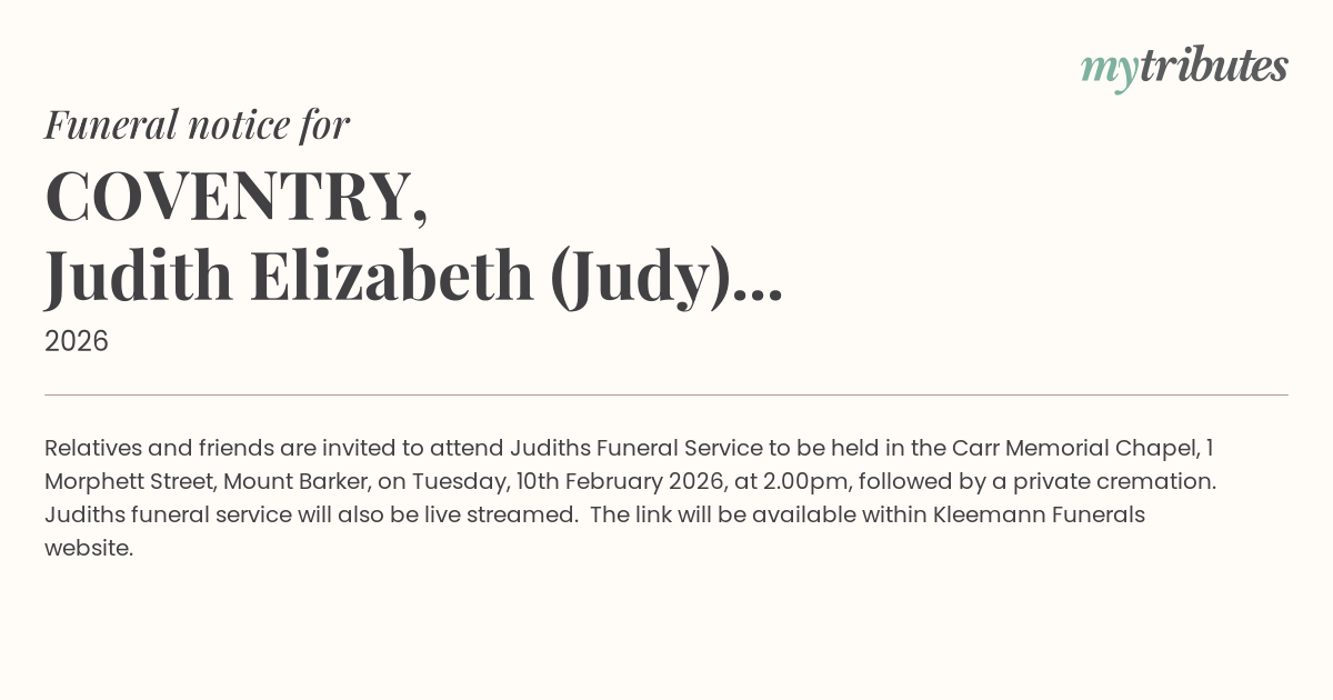 15°CRelatives and friends are invited to attend Judith’s Funeral Service to be held in the Carr Memorial Chapel, 1 Morphett Street, Mount Barker, on Tuesday, 10th February 2026, at 2.00pm, followed by a private cremation. Judith’s funeral service will also be live streamed. The link will be available within Kleemann Funerals website.