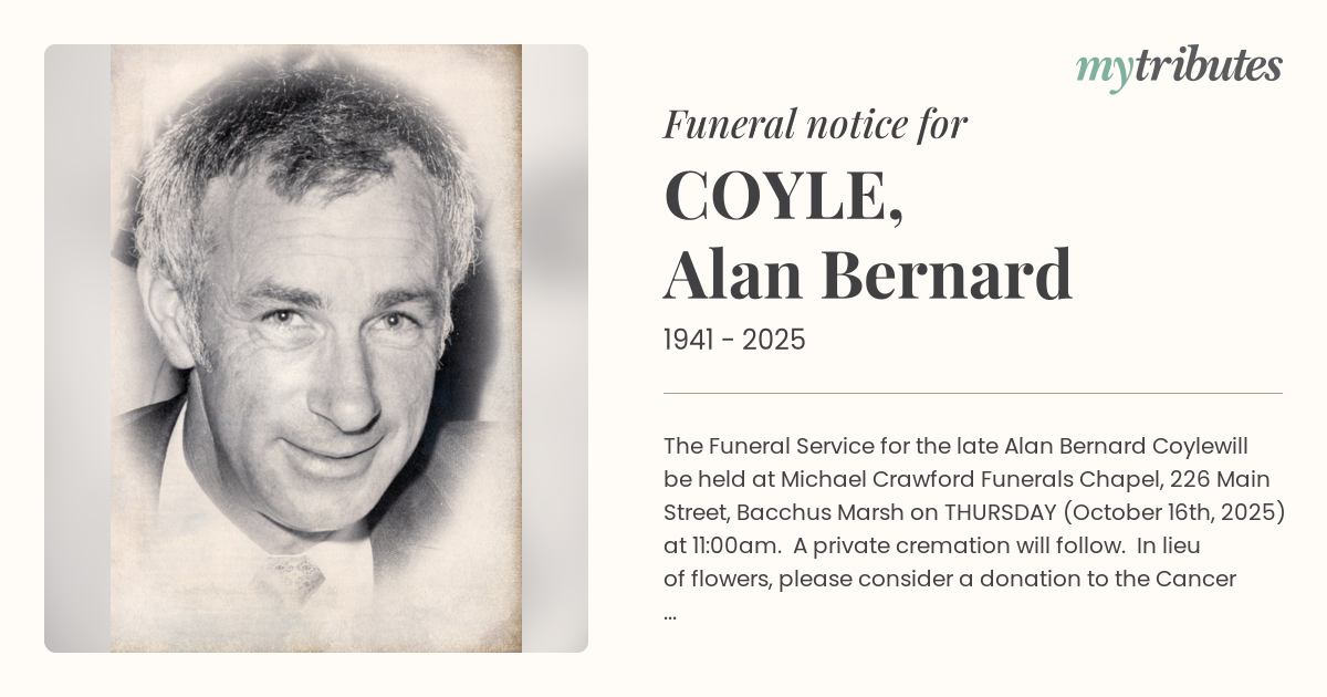 15°CThe Funeral Service for the late Alan Bernard Coyle will be held at Michael Crawford Funerals Chapel, 226 Main Street, Bacchus Marsh on THURSDAY (October 16th, 2025) at 11:00am. A private cremation will follow. In lieu of flowers, please consider a donation to the Cancer Council: cancercouncil.com.au/donate The Service will be Live Streamed and available to view on our website: michaelcrawfordfunerals.com.au (Select - Funeral Notices)