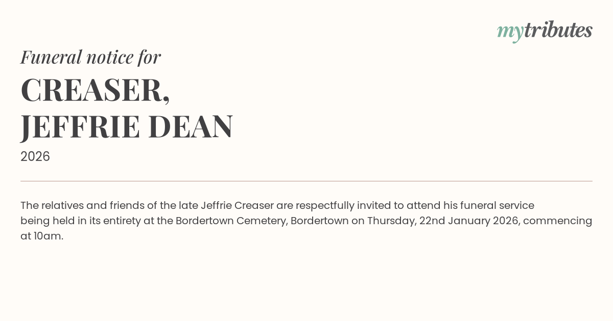 15°CThe relatives and friends of the late Jeffrie Creaser are respectfully invited to attend his funeral service being held in its entirety at the Bordertown Cemetery, Bordertown on Thursday, 22nd January 2026, commencing at 10am.