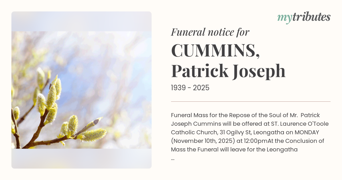 15°CFuneral Mass for the Repose of the Soul of Mr. Patrick Joseph Cummins will be offered at ST. Laurence O'Toole Catholic Church, 31 Ogilvy St, Leongatha on MONDAY (November 10th, 2025) at 12:00pm