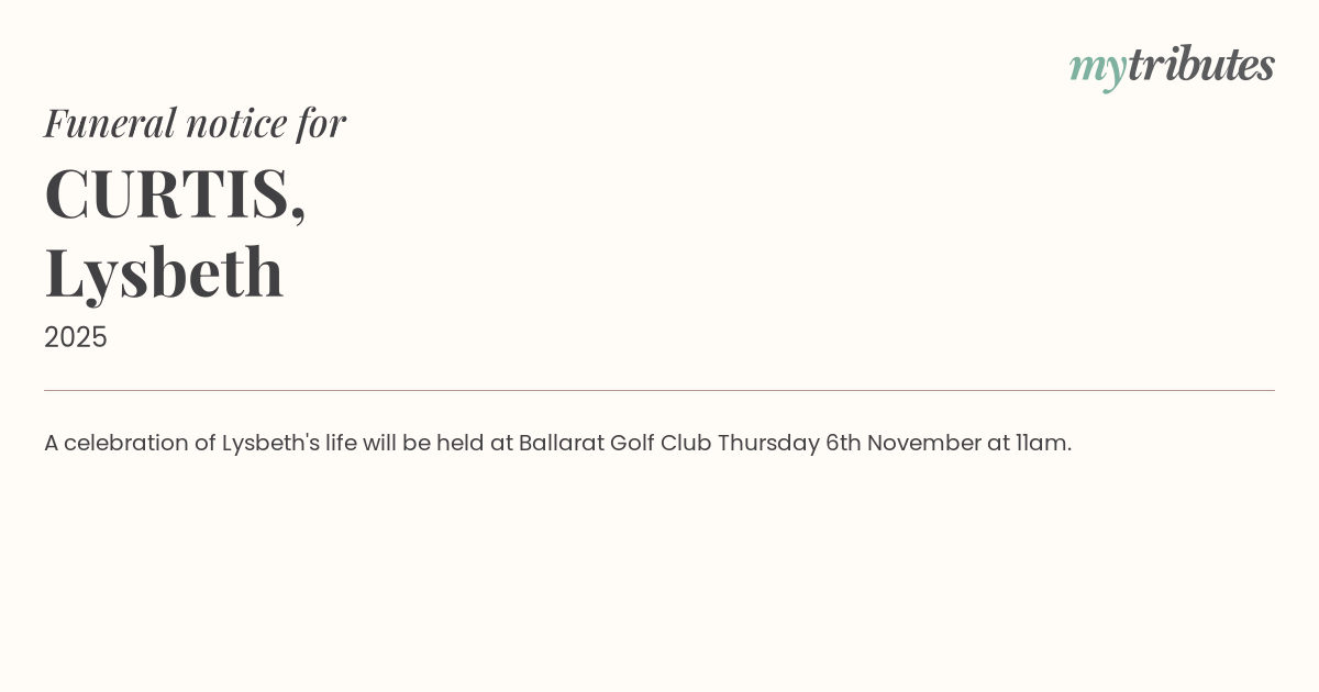 15°CA celebration of Lysbeth's life will be held at Ballarat Golf Club Thursday 6th November at 11am.