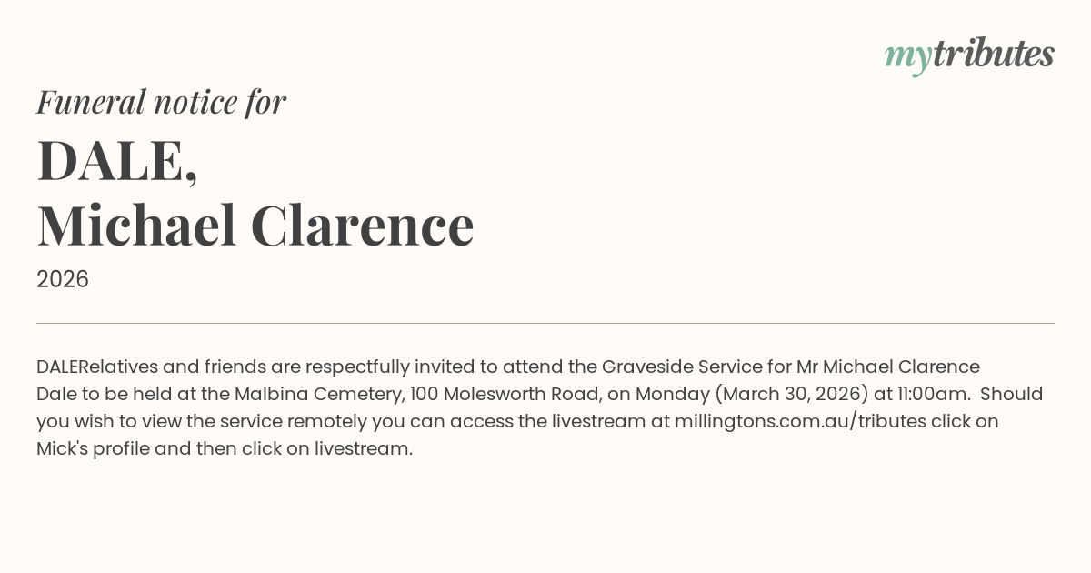 Relatives and friends are respectfully invited to attend the Graveside Service for Mr Michael Clarence Dale to be held at the Malbina Cemetery, 100 Molesworth Road, on Monday (March 30, 2026) at 11:00am. Should you wish to view the service remotely you can access the livestream at millingtons.com.au/tributes click on Mick's profile and then click on livestream.