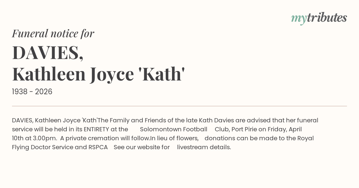 The Family and Friends of the late Kath Davies are advised that her funeral service will be held in its ENTIRETY at the Solomontown Football Club, Port Pirie on Friday, April 10th at 3.00pm.