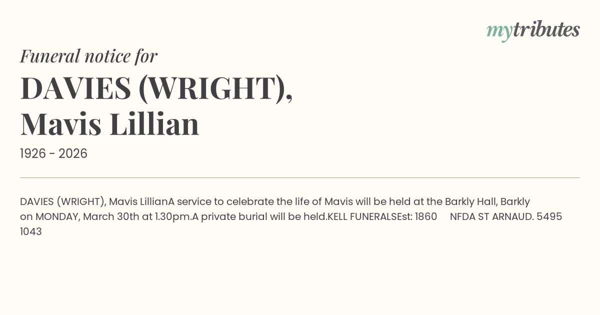 A service to celebrate the life of Mavis will be held at the Barkly Hall, Barkly on MONDAY, March 30th at 1.30pm.