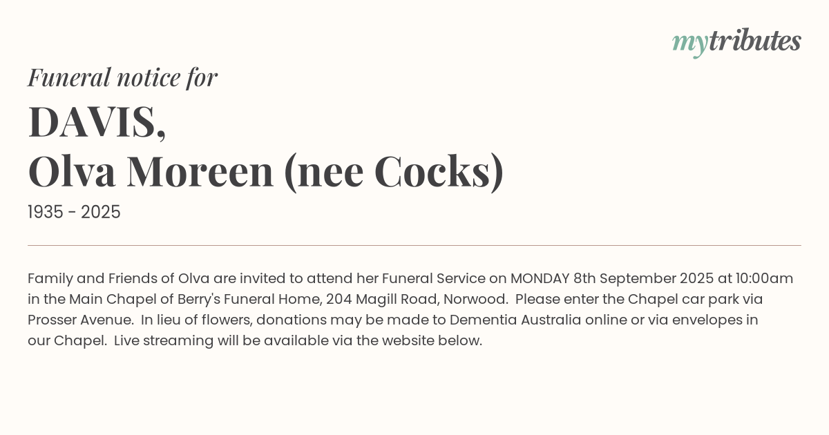 In lieu of flowers, donations may be made to Dementia Australia