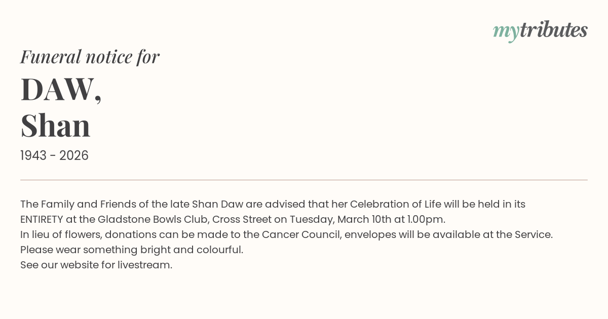 15°CThe Family and Friends of the late Shan Daw are advised that her Celebration of Life will be held in its ENTIRETY at the Gladstone Bowls Club, Cross Street on Tuesday, March 10th at 1.00pm.