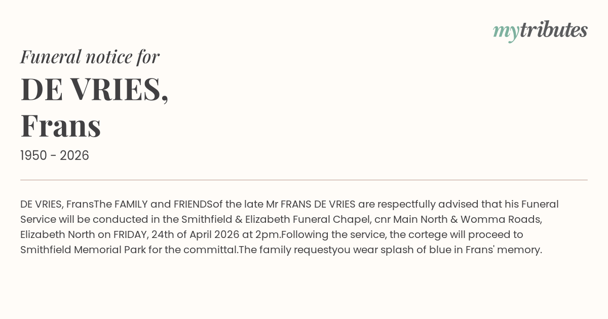 Funeral Chapel, cnr Main North & Womma Roads, Elizabeth North on FRIDAY, 24th of April 2026 at 2pm.