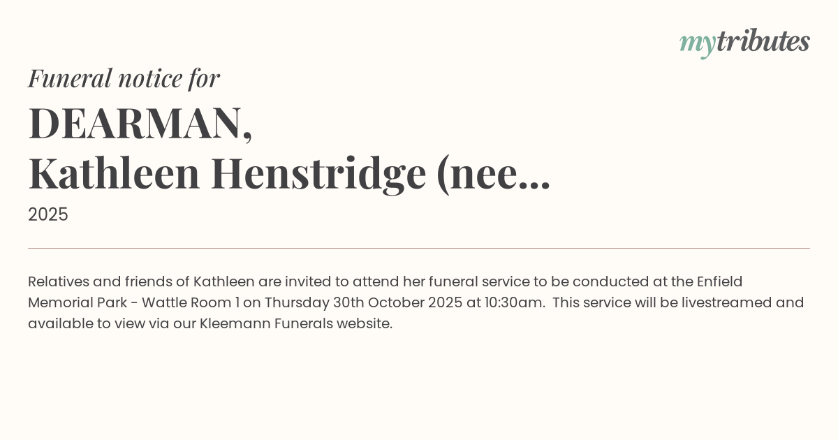 15°CRelatives and friends of Kathleen are invited to attend her funeral service to be conducted at the Enfield Memorial Park - Wattle Room 1 on Thursday 30th October 2025 at 10:30am. This service will be livestreamed and available to view via our Kleemann Funerals website.