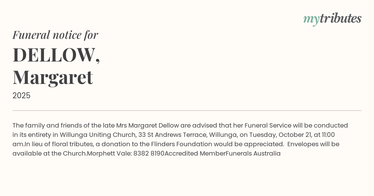 15°CThe family and friends of the late Mrs Margaret Dellow are advised that her Funeral Service will be conducted in its entirety in Willunga Uniting Church, 33 St Andrews Terrace, Willunga, on Tuesday, October 21, at 11:00 am.