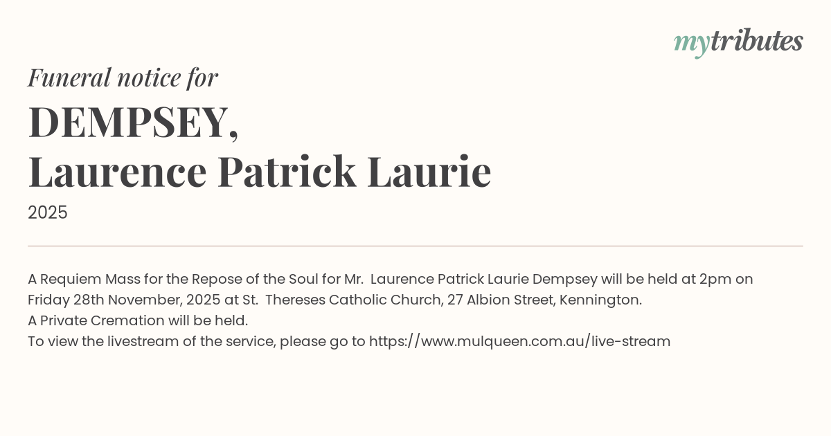 15°CA Requiem Mass for the Repose of the Soul for Mr. Laurence Patrick “Laurie” Dempsey will be held at 2pm on Friday 28th November, 2025 at St. Therese’s Catholic Church, 27 Albion Street, Kennington.
