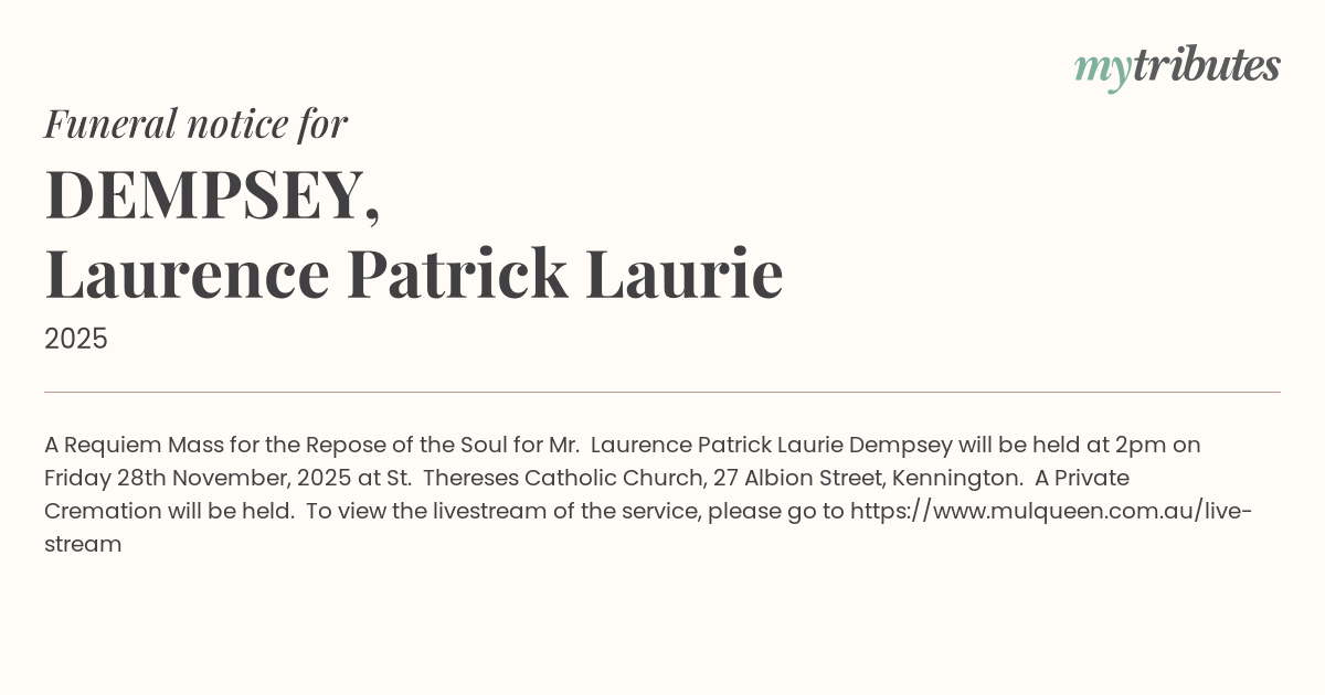 15°CA Requiem Mass for the Repose of the Soul for Mr. Laurence Patrick “Laurie” Dempsey will be held at 2pm on Friday 28th November, 2025 at St. Therese’s Catholic Church, 27 Albion Street, Kennington. A Private Cremation will be held. To view the livestream of the service, please go to https://www.mulqueen.com.au/live-stream