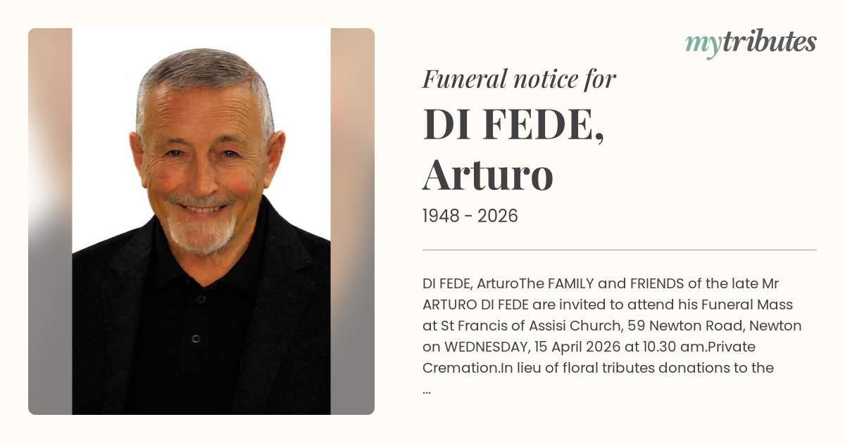 The FAMILY and FRIENDS of the late Mr ARTURO DI FEDE are invited to attend his Funeral Mass at St Francis of Assisi Church, 59 Newton Road, Newton on WEDNESDAY, 15 April 2026 at 10.30 am.