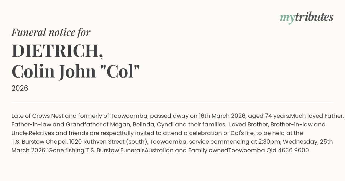 Relatives and friends are respectfully invited to attend a celebration of Col's life, to be held at the T.S. Burstow Chapel, 1020 Ruthven Street (south), Toowoomba, service commencing at 2:30pm, Wednesday, 25th March 2026.