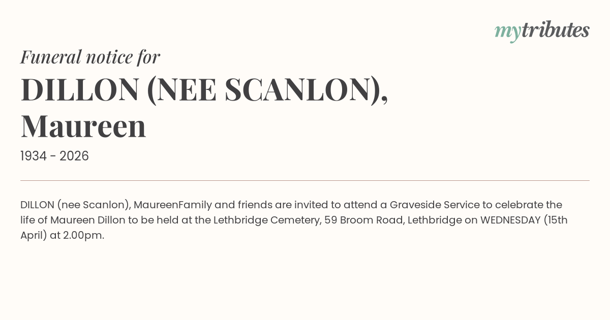 Family and friends are invited to attend a Graveside Service to celebrate the life of Maureen Dillon to be held at the Lethbridge Cemetery, 59 Broom Road, Lethbridge on WEDNESDAY (15th April) at 2.00pm.