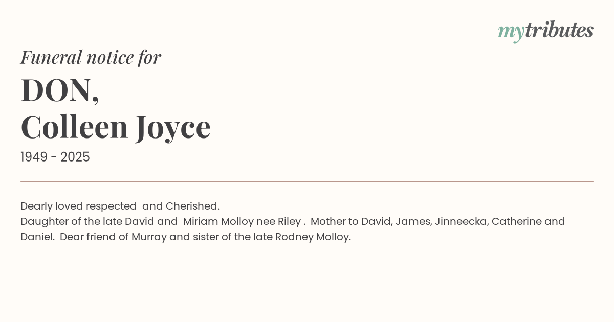Daughter of the late David and Miriam Molloy nee Riley . Mother to David, James, Jinneecka, Catherine and Daniel. Dear friend of Murray and sister of the late Rodney Molloy.
