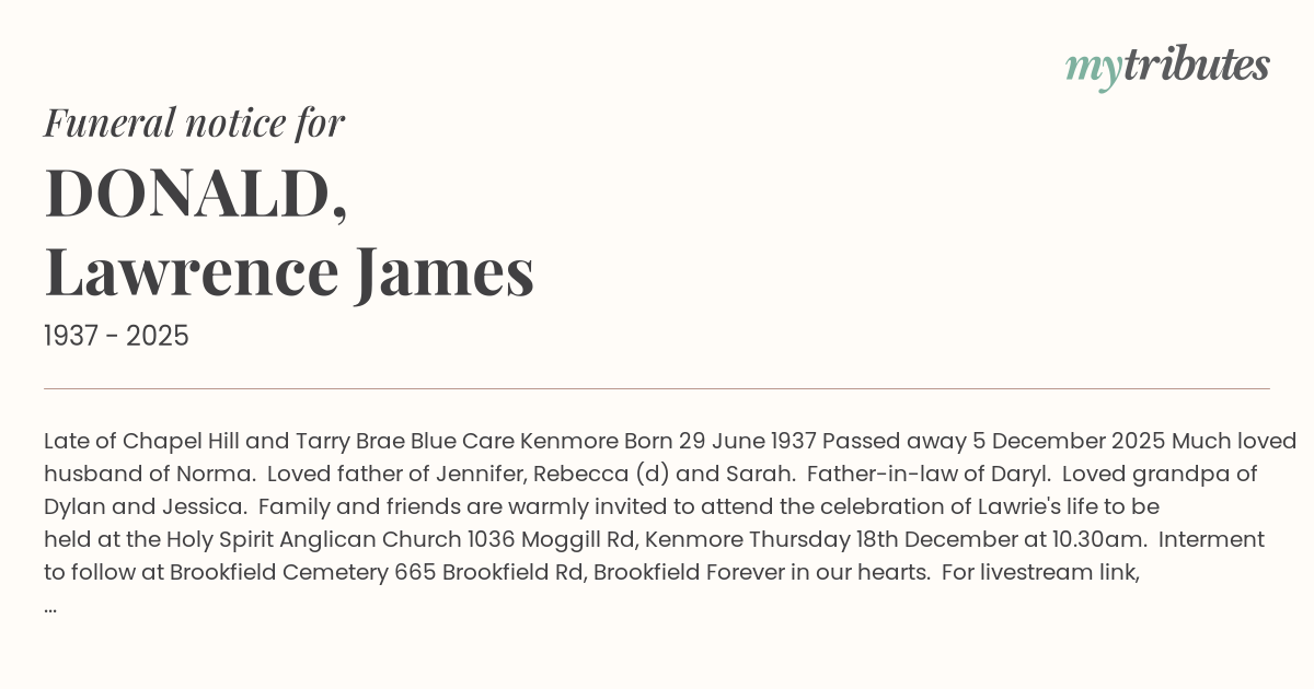 15°CLate of Chapel Hill and Tarry Brae Blue Care Kenmore Born 29 June 1937 Passed away 5 December 2025 Much loved husband of Norma. Loved father of Jennifer, Rebecca (d) and Sarah. Father-in-law of Daryl. Loved grandpa of Dylan and Jessica. Family and friends are warmly invited to attend the celebration of Lawrie's life to be held at the Holy Spirit Anglican Church 1036 Moggill Rd, Kenmore Thursday 18th December at 10.30am. Interment to follow at Brookfield Cemetery 665 Brookfield Rd, Brookfield Forever in our hearts. For livestream link, please visit whiteladyfunerals.com.au
