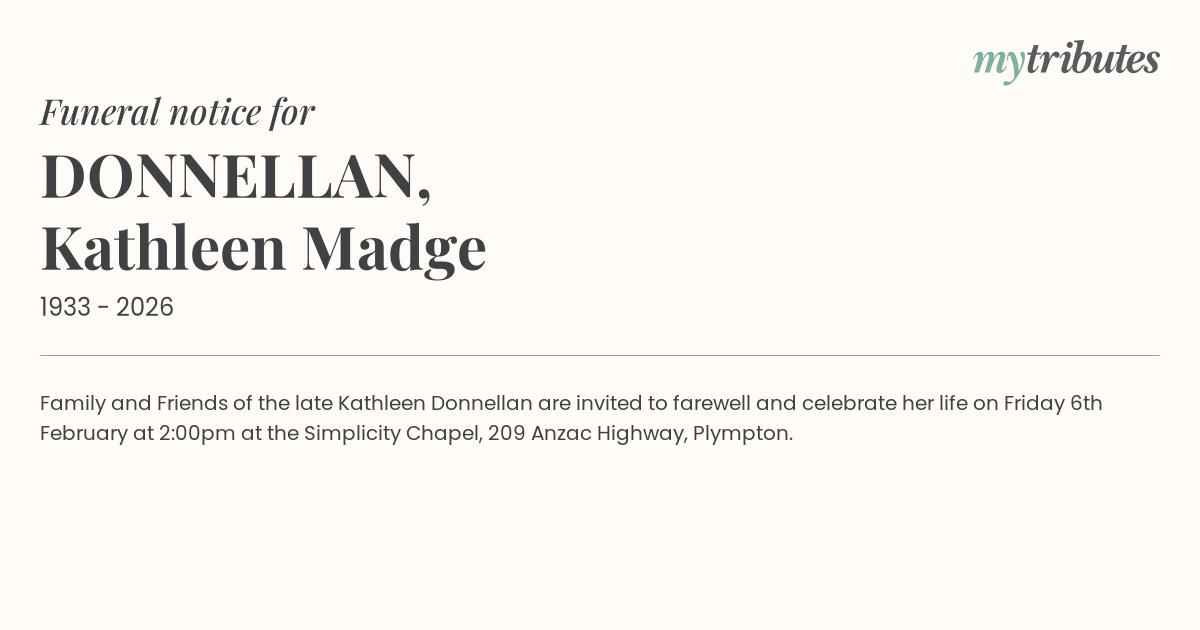 15°CFamily and Friends of the late Kathleen Donnellan are invited to farewell and celebrate her life on Friday 6th February at 2:00pm at the Simplicity Chapel, 209 Anzac Highway, Plympton.