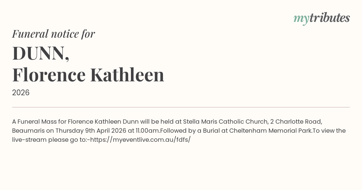 15°CA Funeral Mass for Florence Kathleen Dunn will be held at Stella Maris Catholic Church, 2 Charlotte Road, Beaumaris on Thursday 9th April 2026 at 11.00am.