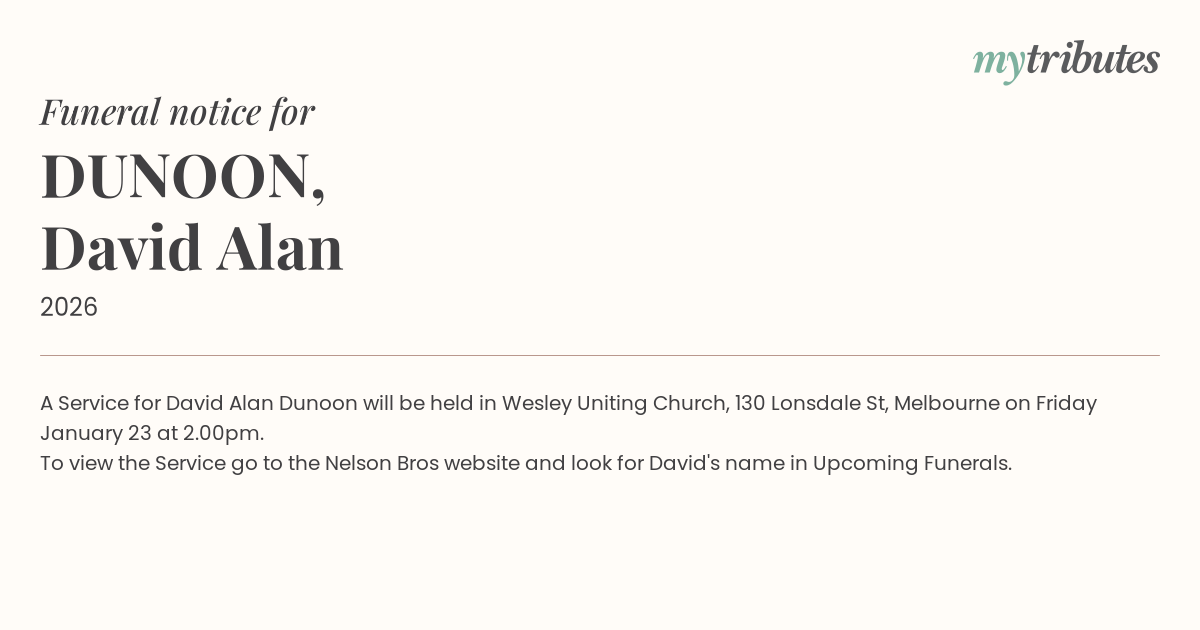 15°CA Service for David Alan Dunoon will be held in Wesley Uniting Church, 130 Lonsdale St, Melbourne on Friday January 23 at 2.00pm.