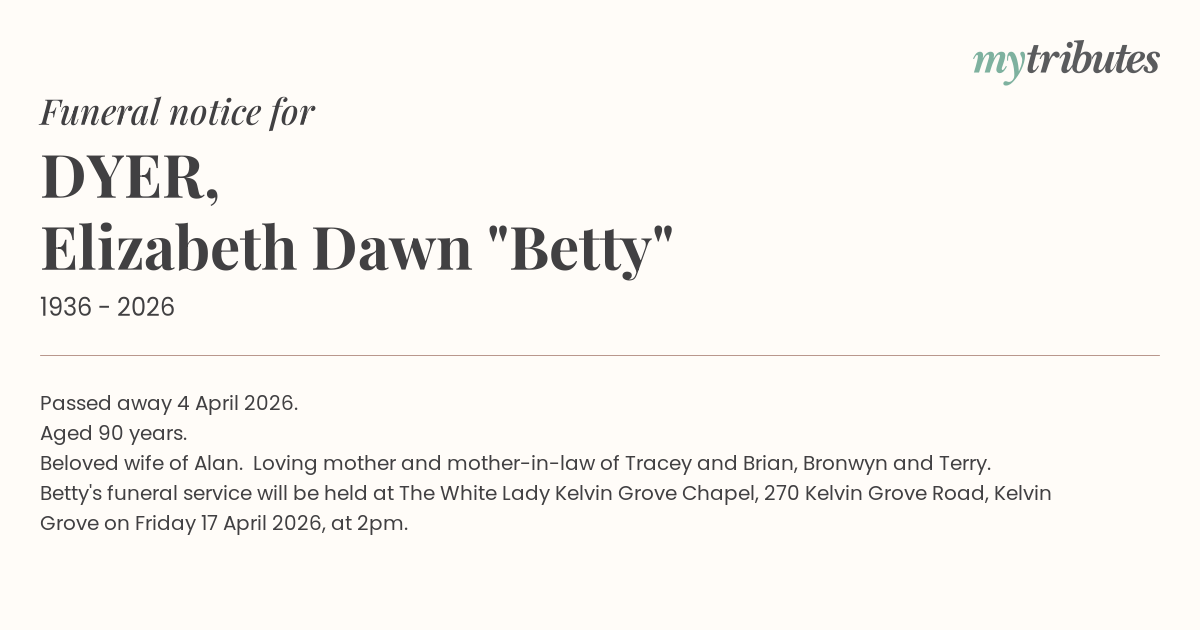 Betty's funeral service will be held at The White Lady Kelvin Grove Chapel, 270 Kelvin Grove Road, Kelvin Grove on Friday 17 April 2026, at 2pm.