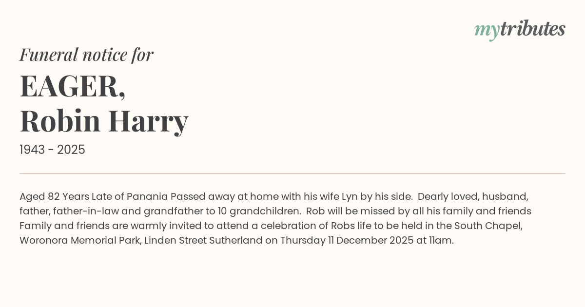Family and friends are warmly invited to attend a celebration of Rob’s life to be held in the South Chapel, Woronora Memorial Park, Linden Street Sutherland on Thursday 11 December 2025 at 11am.
