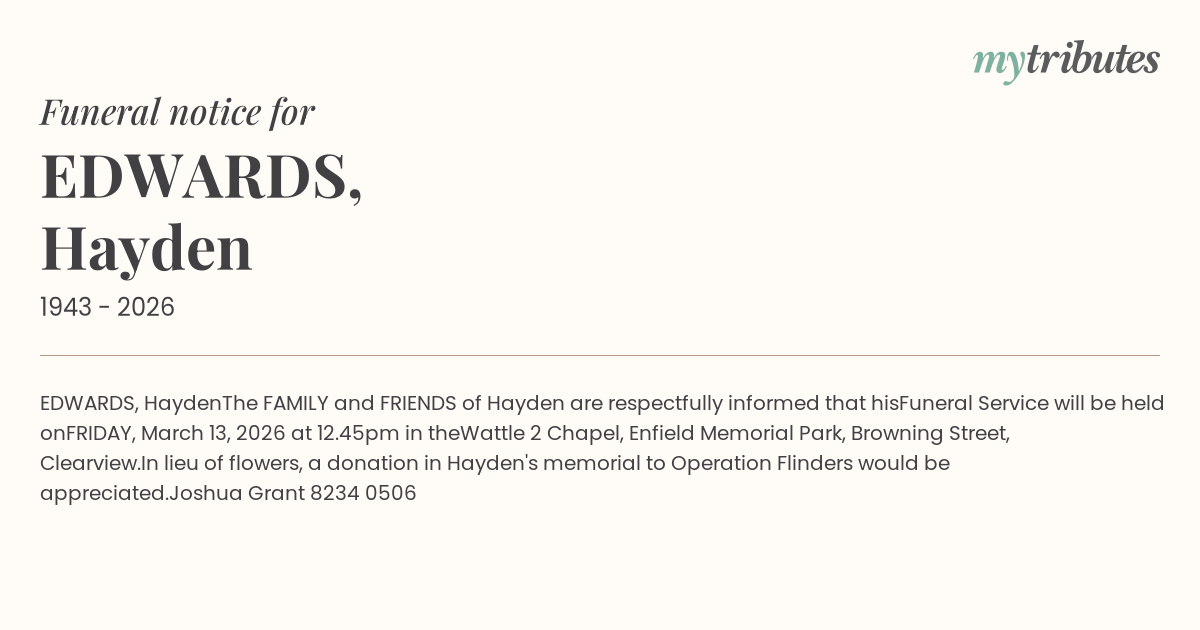 In lieu of flowers, a donation in Hayden's memorial to Operation Flinders would be appreciated.