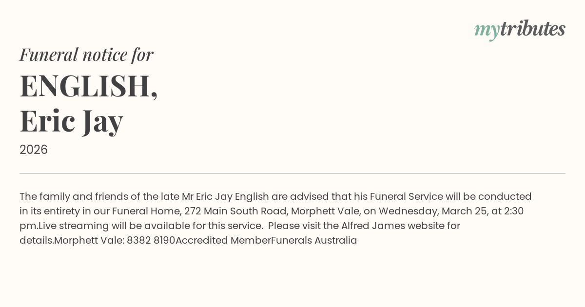 15°CThe family and friends of the late Mr Eric Jay English are advised that his Funeral Service will be conducted in its entirety in our Funeral Home, 272 Main South Road, Morphett Vale, on Wednesday, March 25, at 2:30 pm.