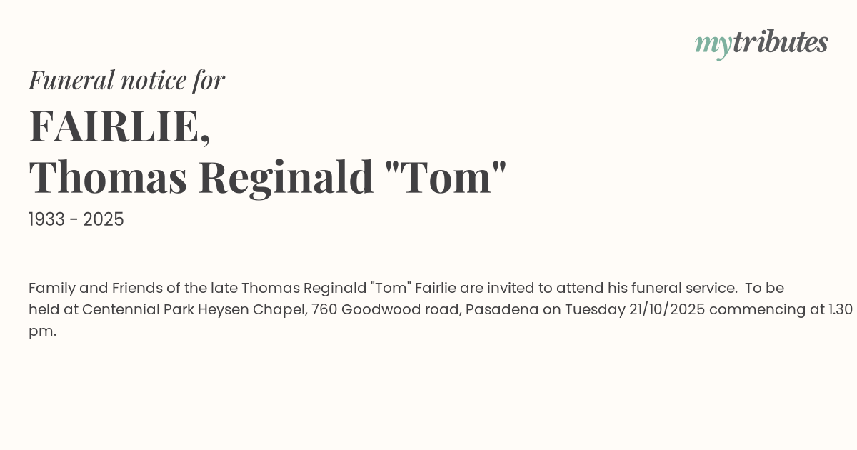 15°CFamily and Friends of the late Thomas Reginald "Tom" Fairlie are invited to attend his funeral service. To be held at Centennial Park Heysen Chapel, 760 Goodwood road, Pasadena on Tuesday 21/10/2025 commencing at 1.30 pm.
