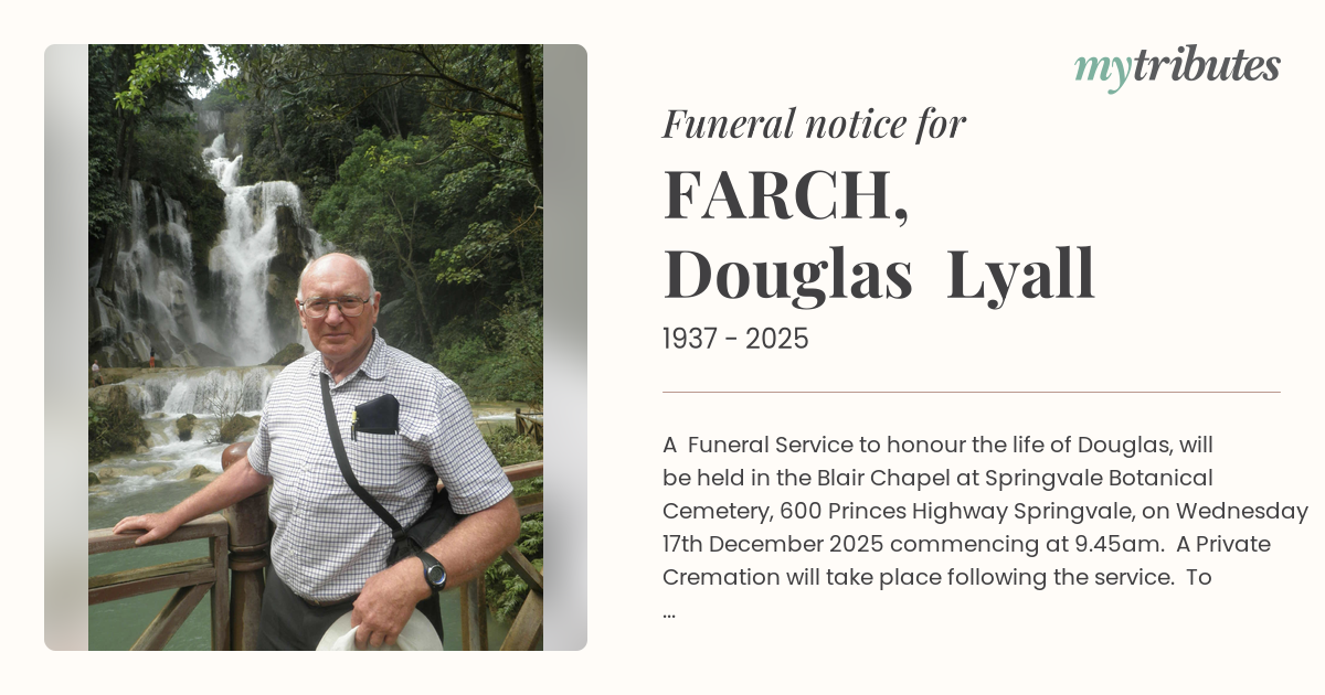 15°CA Funeral Service to honour the life of Douglas, will be held in the Blair Chapel at Springvale Botanical Cemetery, 600 Princes Highway Springvale, on Wednesday 17th December 2025 commencing at 9.45am. A Private Cremation will take place following the service.