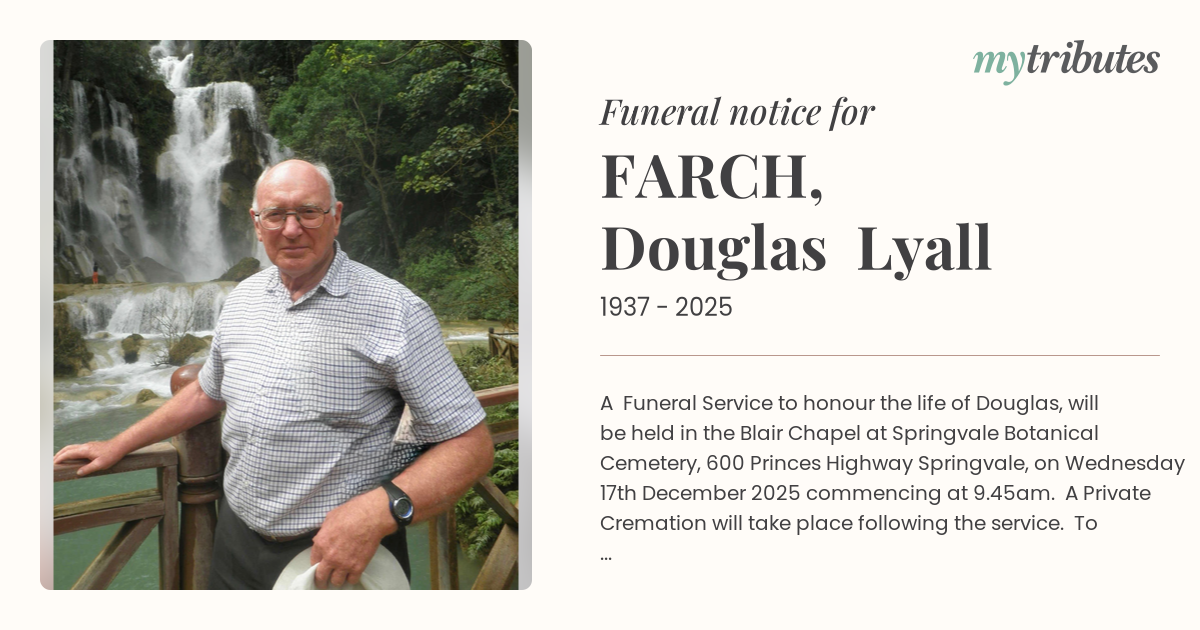 15°CA Funeral Service to honour the life of Douglas, will be held in the Blair Chapel at Springvale Botanical Cemetery, 600 Princes Highway Springvale, on Wednesday 17th December 2025 commencing at 9.45am. A Private Cremation will take place following the service.