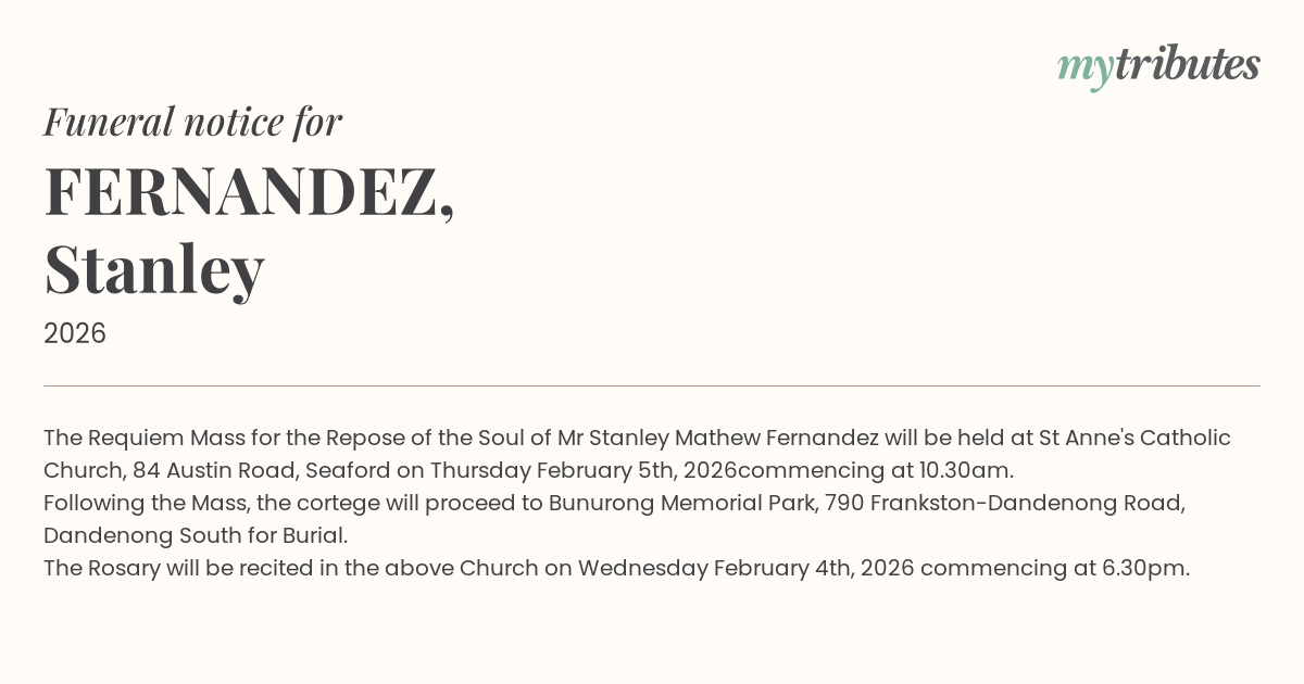 15°CThe Requiem Mass for the Repose of the Soul of Mr Stanley Mathew Fernandez will be held at St Anne's Catholic Church, 84 Austin Road, Seaford on Thursday February 5th, 2026commencing at 10.30am.
