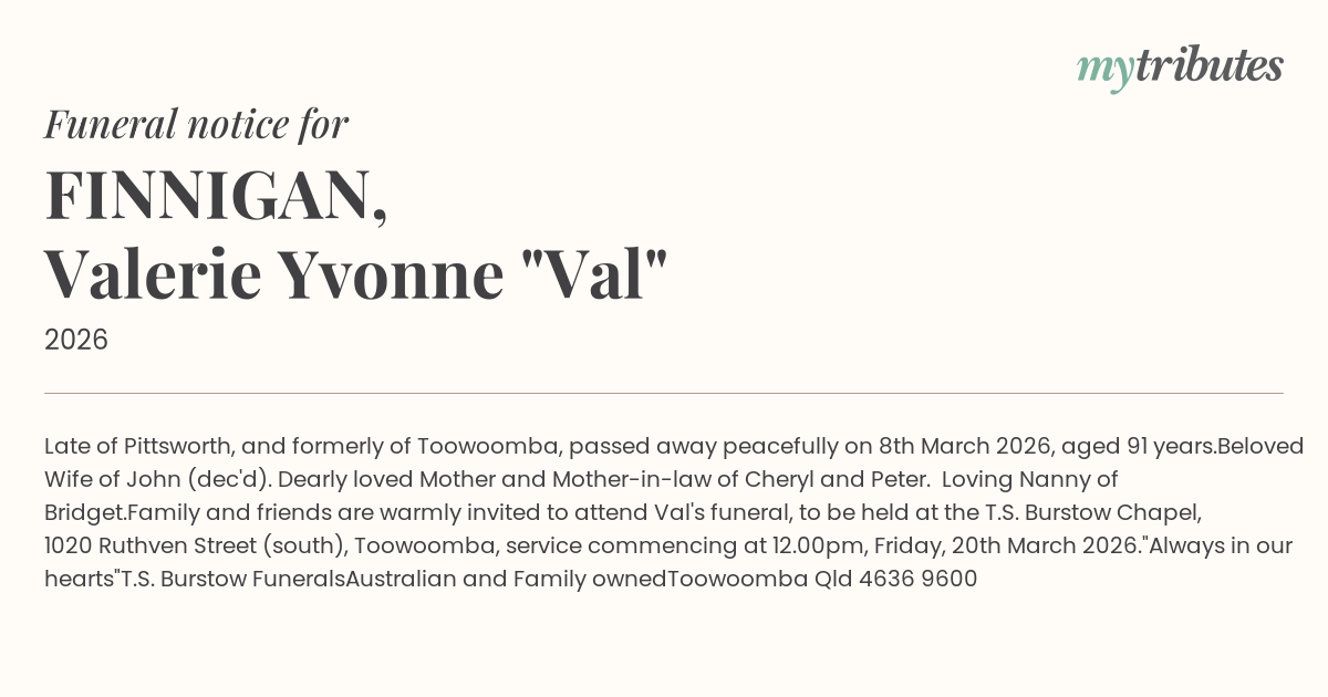 Family and friends are warmly invited to attend Val's funeral, to be held at the T.S. Burstow Chapel, 1020 Ruthven Street (south), Toowoomba, service commencing at 12.00pm, Friday, 20th March 2026.