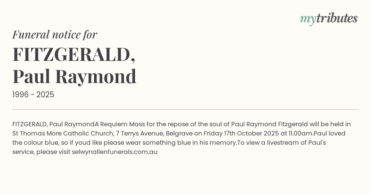 A Requiem Mass for the repose of the soul of Paul Raymond Fitzgerald will be held in St Thomas More Catholic Church, 7 Terrys Avenue, Belgrave on Friday 17th October 2025 at 11.00am.