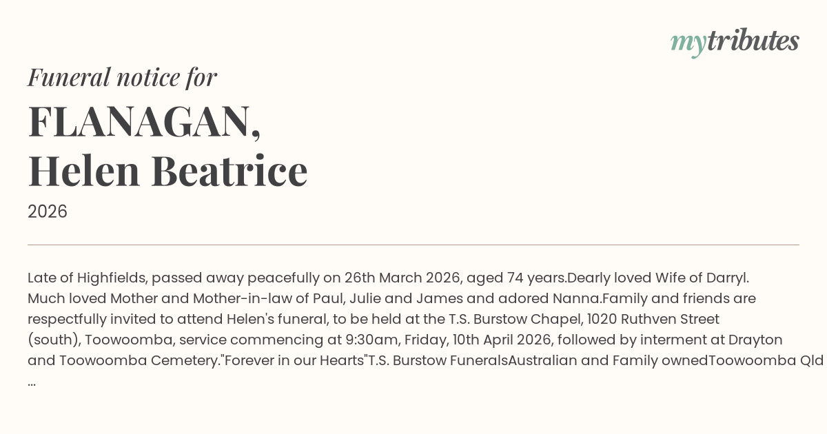 Family and friends are respectfully invited to attend Helen's funeral, to be held at the T.S. Burstow Chapel, 1020 Ruthven Street (south), Toowoomba, service commencing at 9:30am, Friday, 10th April 2026, followed by interment at Drayton and Toowoomba Cemetery.