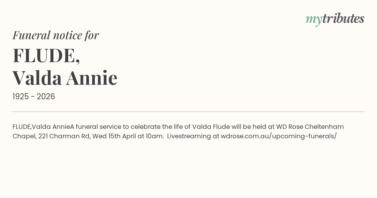 A funeral service to celebrate the life of Valda Flude will be held at WD Rose Cheltenham Chapel, 221 Charman Rd, Wed 15th April at 10am. Livestreaming at wdrose.com.au/upcoming-funerals/